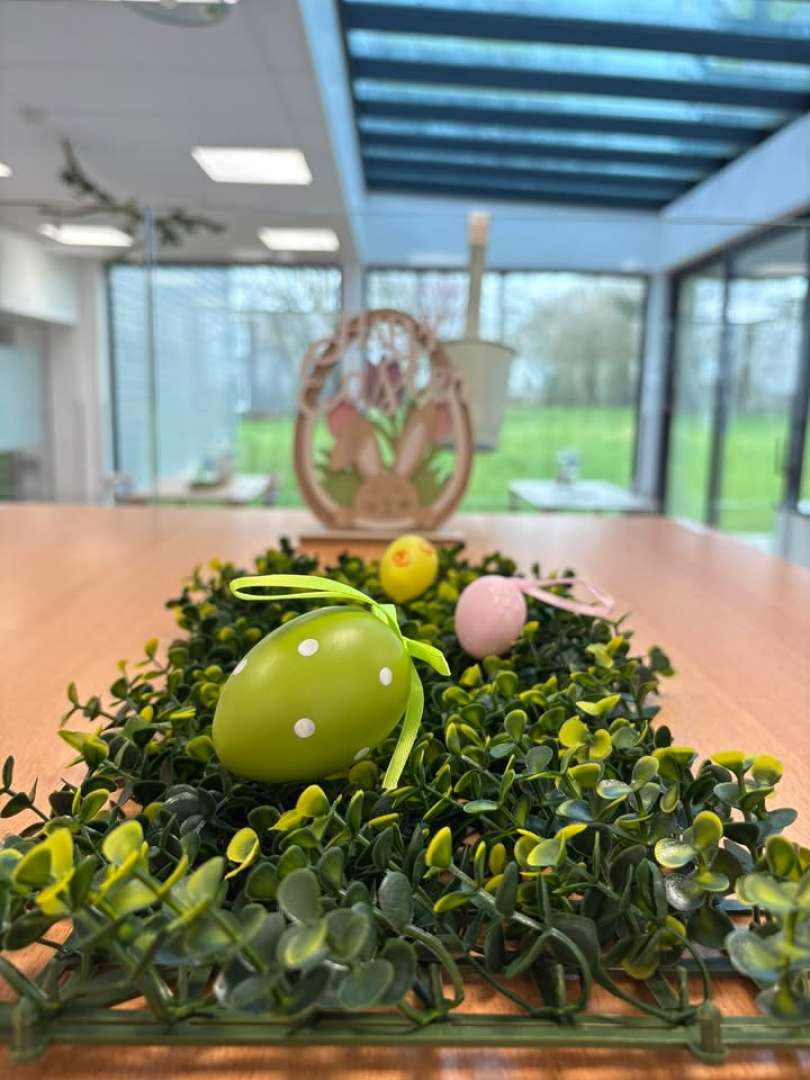 Avec l'arrivée des beaux jours, notre maison de repos a revêtu ses plus belles couleurs printanières. Les espaces communs ont été décorés avec soin : des guirlandes fleuries suspendues au plafond, des compositions florales sur les tables, des lapins malicieux cachés dans les coins et des œufs de Pâques colorés qui émerveillent petits et grands.