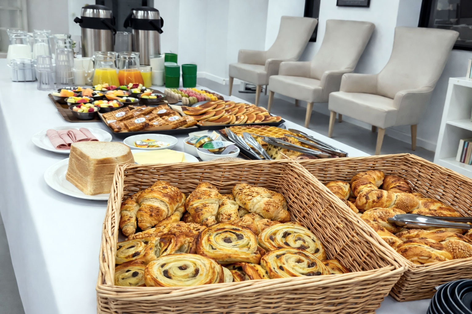Une fois par mois, la maison de repos organise un petit-déjeuner buffet. Les résidents qui désirent y participer sont invités à venir prendre leur petit-déjeuner dans la salle à manger qui est décorée pour l’occasion.